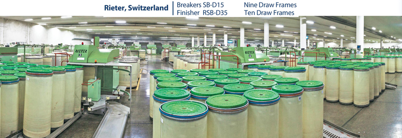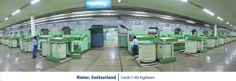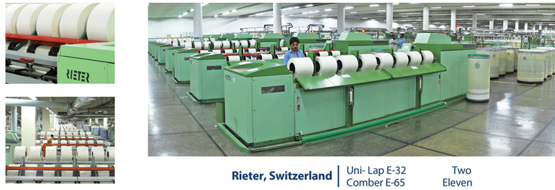 | Combing of the fiber is also being performed by the Reiter made combers E- 65 which help to reduce dirt and short fiber. It also plays vital role in getting optimum geometry of combing, strengthening and making the fiber more parallel in order to have a smoother, more uniformed and stronger yarn. |