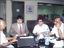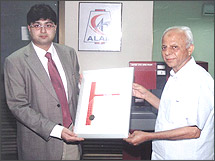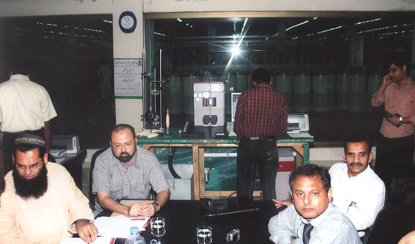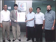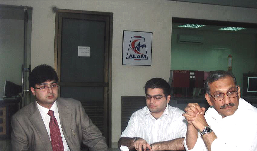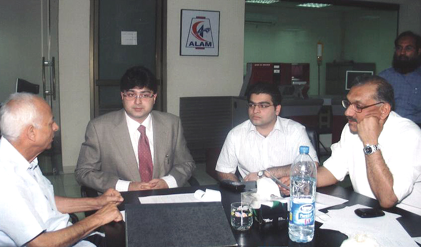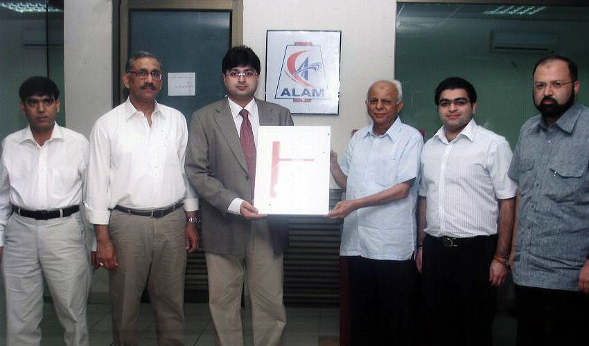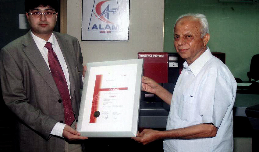 Mr. Rauf of Uster Technologies AG, Switzerland awarding Usterized Certificate to Mian Faraz Alam and Mian Hammad Alam of Alam Cotton Mills.